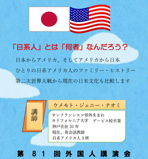 日系アメリカ人3世のウメモト・ジェニー・ナオミさんが、ご自身の家族の歴史を通して、日米の文化や「日系人」のアイデンティティについてお話しします。